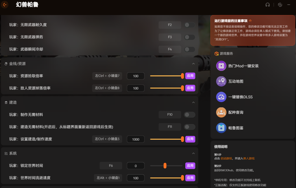 最近发现一款XMOD修改器挺好用。最实用的就是无限体力,跑图探索再也不用来回喘气休息了。还有无饥饿功能开了以后,角色和帕鲁都不会饿肚子,省得老惦记着做饭喂食那点事。