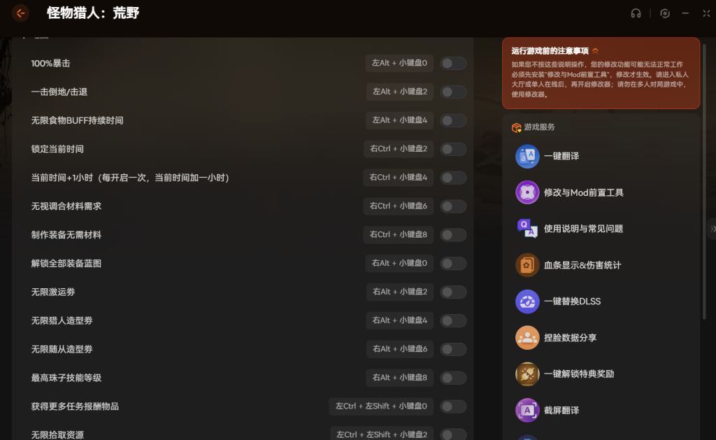 用之前记得先装那个修改与Mod前置工具,不然功能不生效。进游戏后最好开私人大厅或者单人在线模式,别去多人房间用。游戏更新后有些mod可能要等适配,耐心等等就好。这软件功能确实全,想轻松玩怪猎的可以试试。