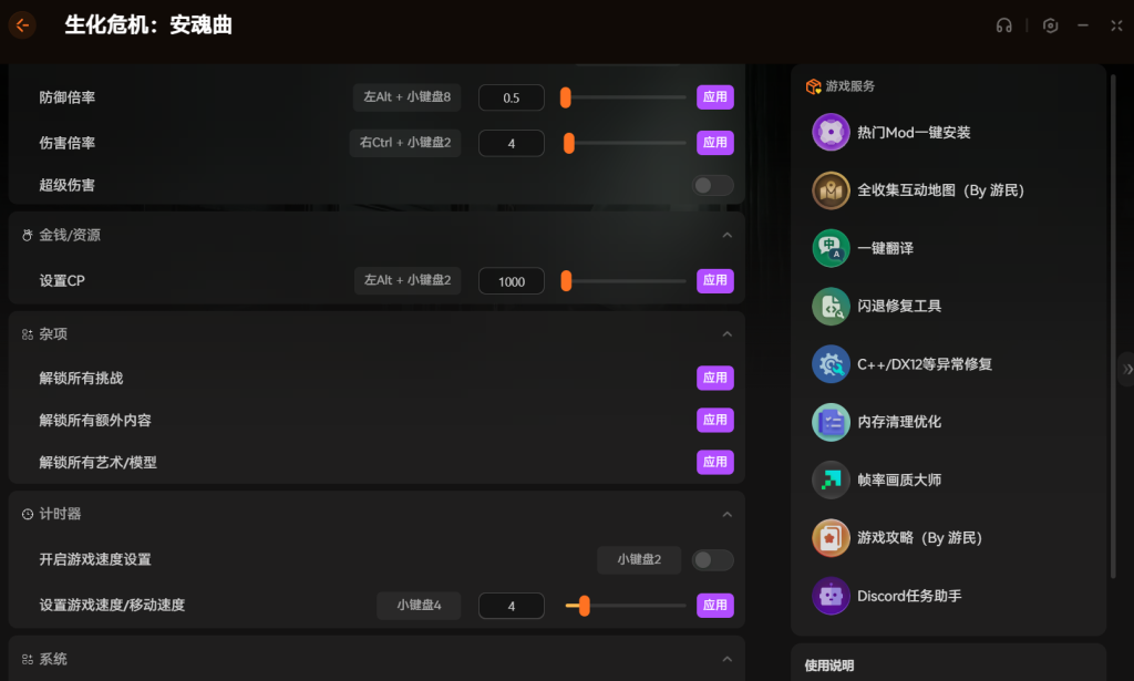 另外像防御倍率、设置游戏速度这些也能调,想慢慢搜东西或者想跑快点都行。还有解锁所有挑战和额外内容的功能,不用自己慢慢打条件去刷了。如果电脑配置一般,里面还带了内存清理和帧率优化,玩起来能流畅点。