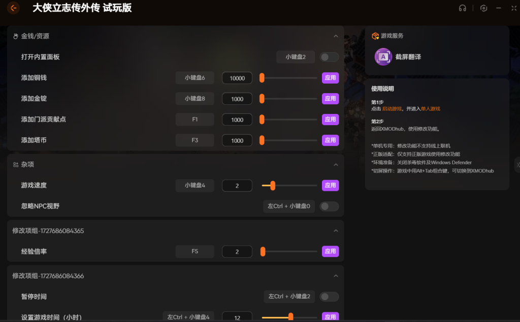 如果门派贡献不够,按F1就能加;塔币不够就按F3。这修改器还有个暂停时间的功能,左Ctrl加小键盘2就能让时间静止,方便你慢慢做任务。设置具体时间也行,左Ctrl加小键盘4就可以调整。