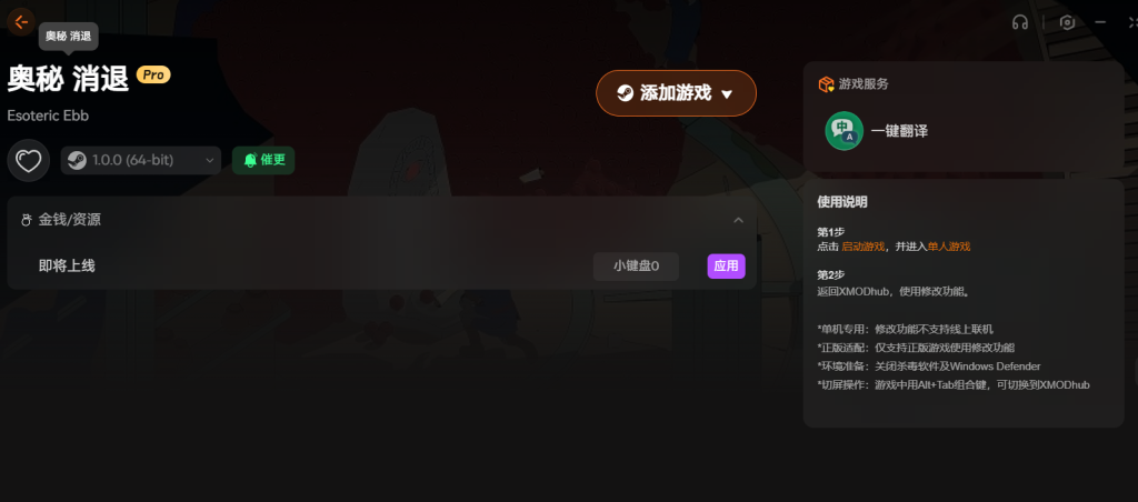 XMOD用起来也简单。先打开游戏进单人模式,然后切出来回到XMODhub点应用修改就行。切屏用Alt加Tab组合键,来回切换很方便。用之前最好把杀毒软件关掉,免得误报。