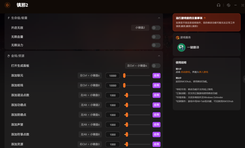 这修改器只支持单机用,玩线上联机的时候别开。用之前最好把杀毒软件关一下,有时候会误拦。总之想轻松点玩镇邪2的,可以试试这个。