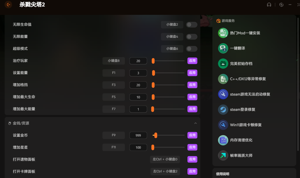 修改 器的基本功能也全。能量和金钱是玩这游戏最缺的,它能直接锁定无限或者自己设置具体数值 。血量不够了就按个键治疗一下,不用重开一局。遇到打不过的boss,开个无限护甲或者超级伤害就过去了 。游戏速度也能调,不想看动画慢吞吞的直接开倍速速刷。