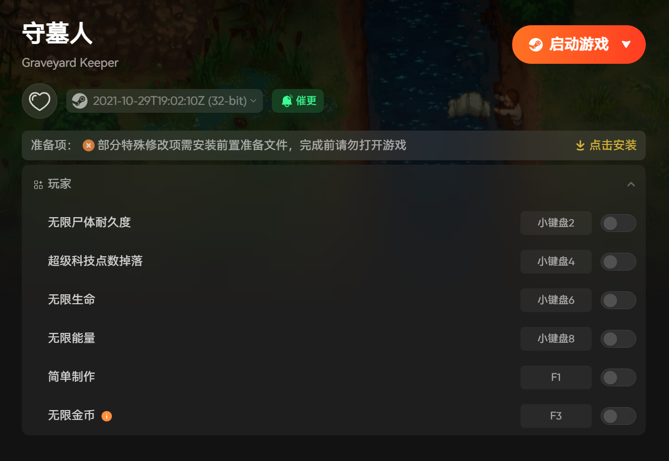 推荐试试适配新版本的XMOD修改器(口令【芒果】获取时长),功能强大且安装简单,完美适配steam免费领取的版本,让你的守墓经营之路彻底告别繁琐,乐趣翻倍。