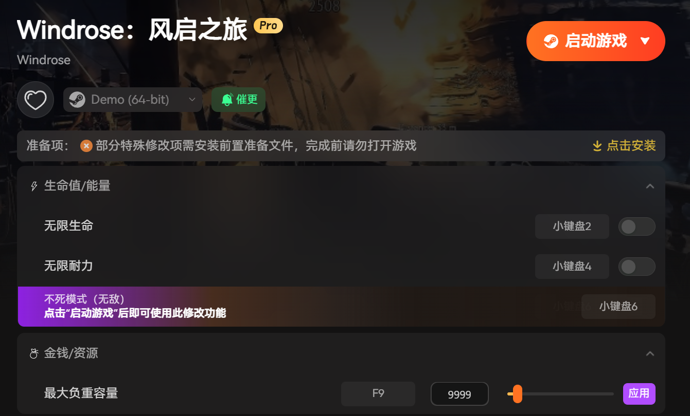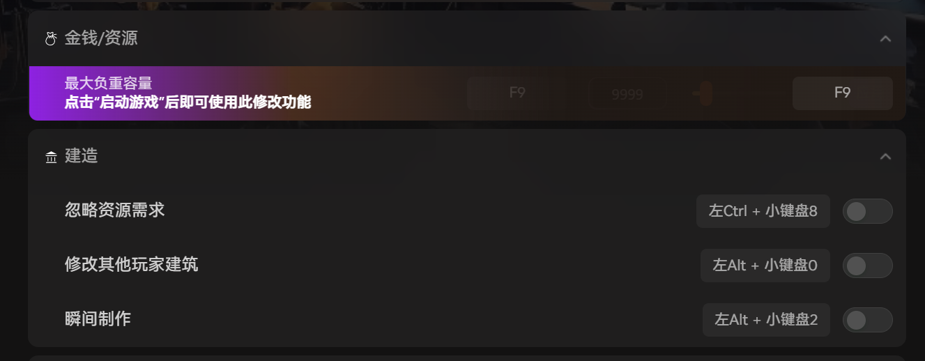 如图所示,这款修改器核心解锁最大负重容量与忽略资源需求两大实用功能,再也不用为了搜集木材、金属等资源跑断腿,不用纠结背包空间不足,各类珍稀材料随心拾取、随心使用,轻松建造从简易小屋到恢宏堡垒的各类建筑。