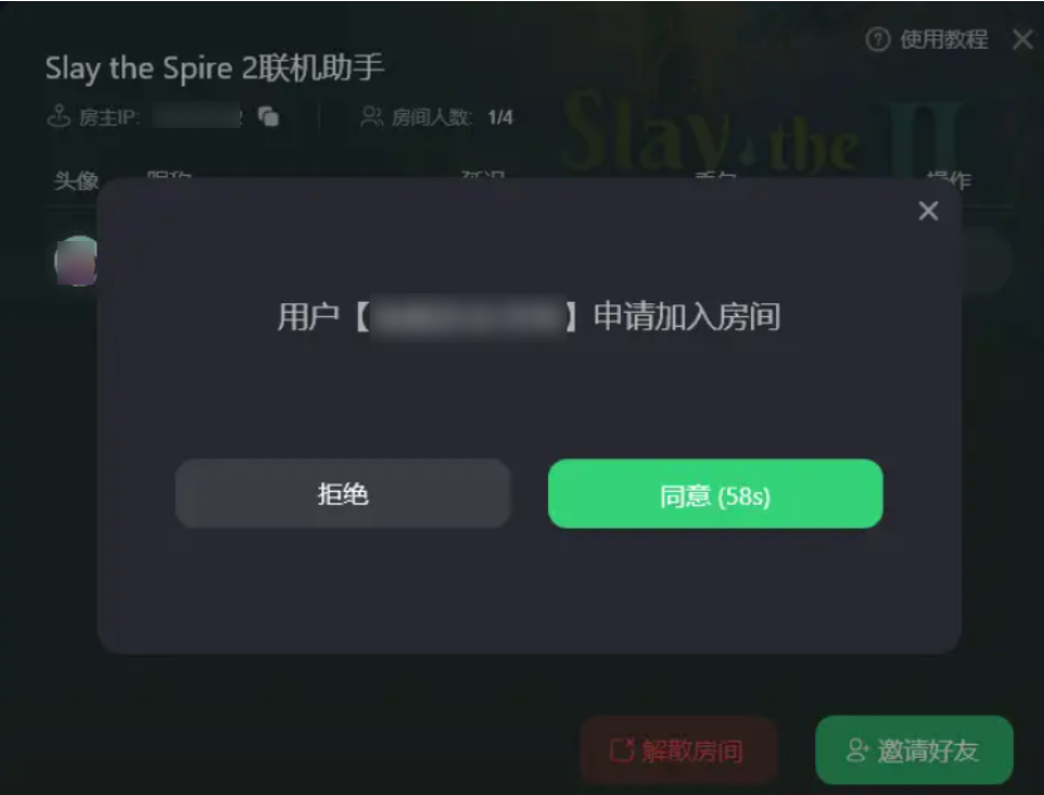 - 好友加入房间时会发送申请,点击同意后即可进入房间
