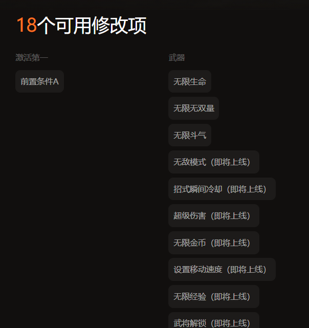 真三国无双起源是一款割草类的游戏,而大家使用XMOD xiu改器则可以设置移动速度,这样大家可以突破被包围的范圈。同时你们还可以开启无限生命、无敌模式、招式瞬间冷却、无限金币等功能,目前已知XMOD将会上线18个可修改选项,等游戏正式发售之后,XMOD的团队会根据游戏的玩法上线更多的可修改选项。