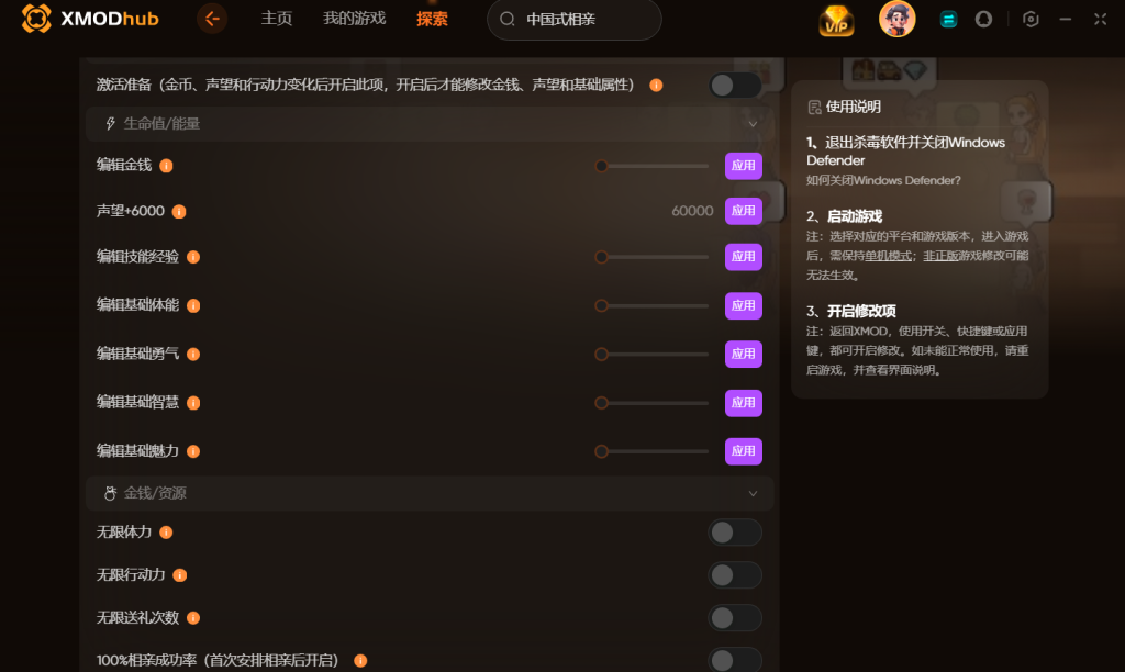 对于中国式相亲这样的模拟经营游戏金钱尤其重要,并且在游戏中会有体能勇气、智慧等属性,而大家使用XMOD修改 器则可以编辑金钱,增加声望、体能、智慧,还可以开启无限体力、增加双倍移动速度等操作。这些选项大家可以自由的决定是否开启,并且决定增加的数量。
