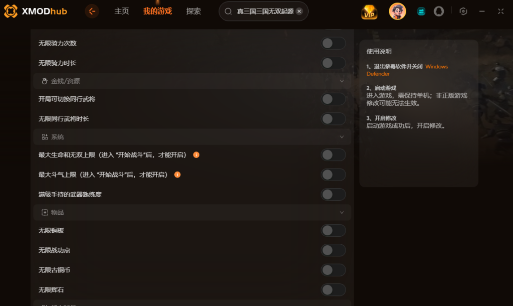 根据游戏的玩法,XMOD可提供大量的可修改选项。比如对于真三国三国无双起源这款游戏,大家就可以开启无限的生命、超级伤害、超级防御,这样就没有你们打不赢的boss。同时你们还可以获得各类武将皮肤以及切换武将,突破游戏的重重限制,快速获得你想要的需求。