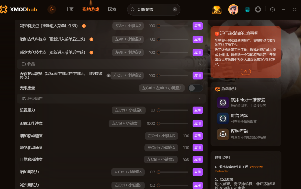 比如大家点击幻兽帕鲁进入到它的修改页面之后,可以看到此次为你们提供了大量的修改方案,大家可以开启恢复食物、食物不腐烂以及还能开启帕鲁百分百补货率增加。设置帕鲁属性,这样基本上你们可以在游戏中达到无敌的存在,快速将自己的游戏世界打造得更好,同时你们还可以设置工作速度以及移动速度,解决游戏的各方面限制。