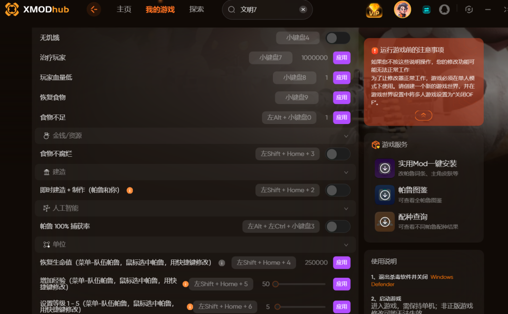 同时右侧为你们准备的是多款mod以及工具,大家可以修改帕鲁的词条以及更换主角皮肤和查看帕鲁配种结果,可以帮助你们更便捷的游玩游戏,更能体验到游戏带来的乐趣。