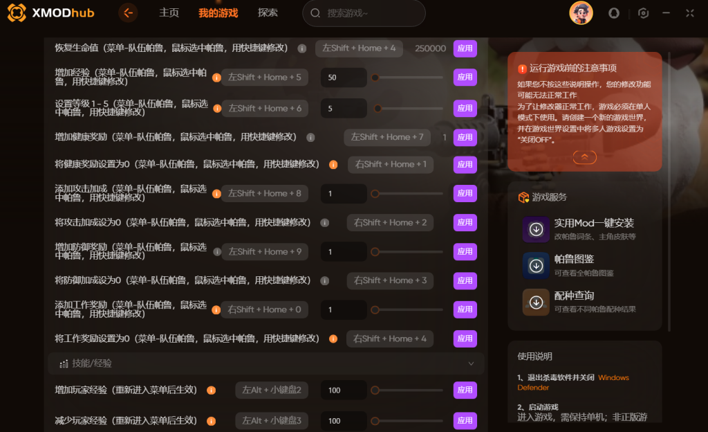 玩家使用XMOD修改 器除了可以开启帕鲁百分百捕获率。你们还可以设置帕鲁的攻击加成、防御奖励以及工作奖励等选项。