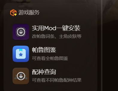 在XMOD修改 器中幻兽帕鲁的修改页面,右侧的游戏服务为大家提供了配种查询以及修改帕鲁词条、主角皮肤等mod。