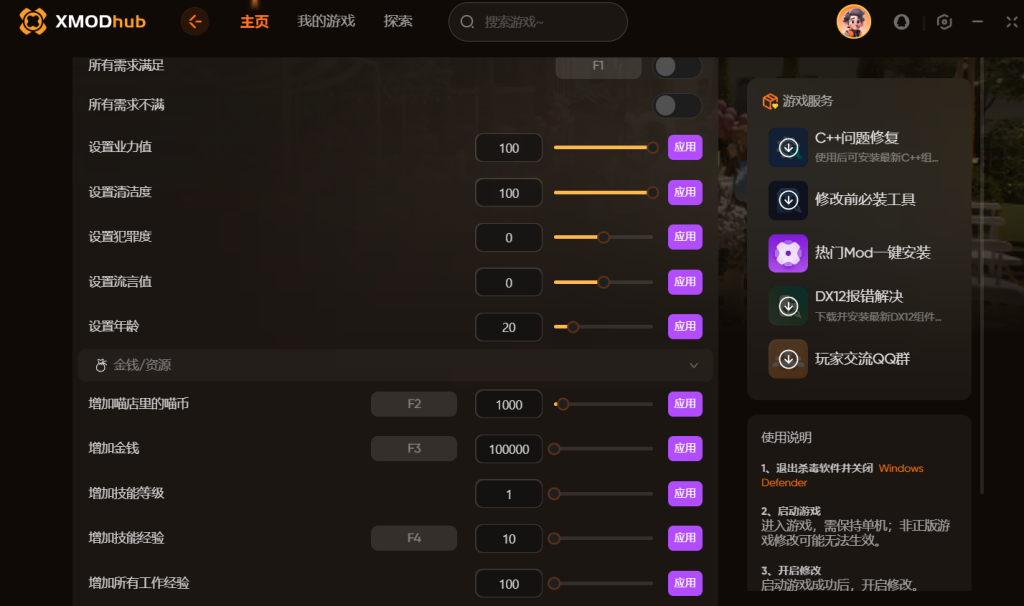 右侧为你们提供的是丰富多样的修改方案,大家可以增加金钱和喵店里的喵币,还能设置角色年龄以及增加技能等级、爱情关系、友情关系等等,玩家可以依照自己的实际情况自由调整。