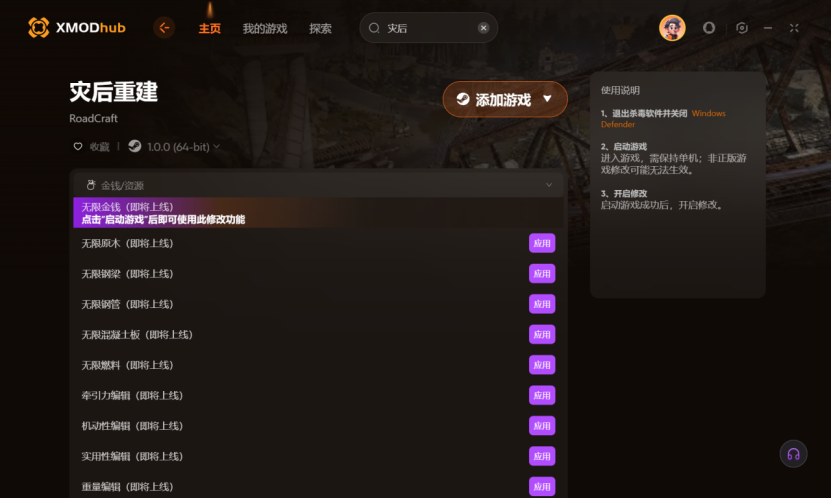 RoadCraft灾后修复师轻松获取资源 XMOD 修改器必备功能推荐