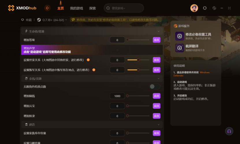 家族声望也是游戏中的重要元素,高声望能吸引更多人才加入家族,还能在城中获得更好的发展机会。XMOD 修改器可以快速增加声望,让你的家族在众多世家之中崭露头角。同时,增加等级也不在话下,随着等级提升,家族能解锁更多功能,开启新的发展篇章。