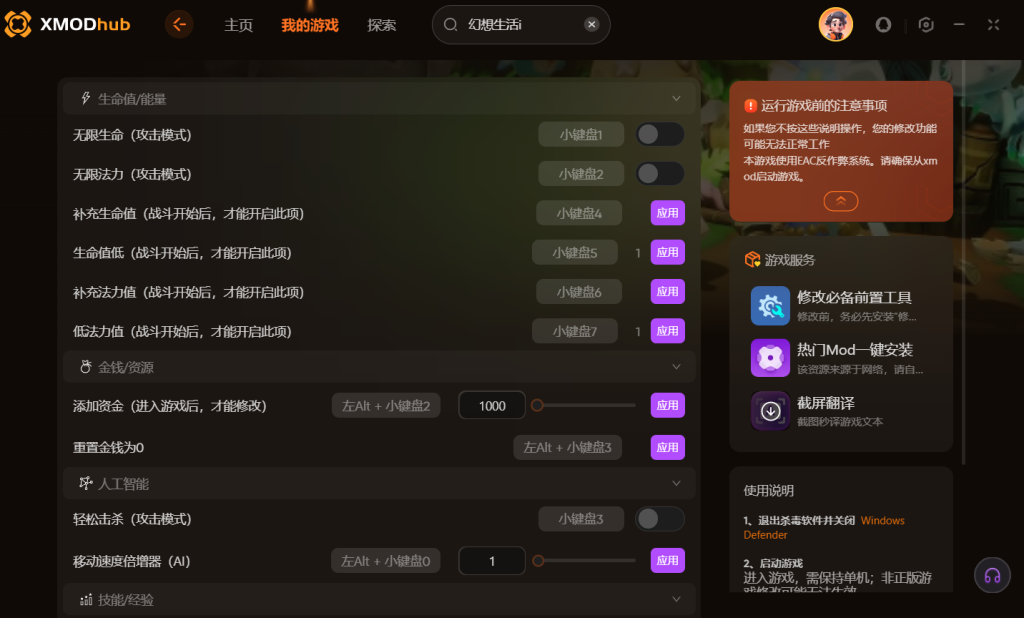 玩家体验幻想生活i最主要是为了休息的时候放松一下,所以战斗的方式无需太难,你们可以使用XMOD修改 器开启无限生命、无限法力、轻松击杀,同时游戏中的资金玩家无需去肝,只需要使用XMOD设置你想要的数量即可。