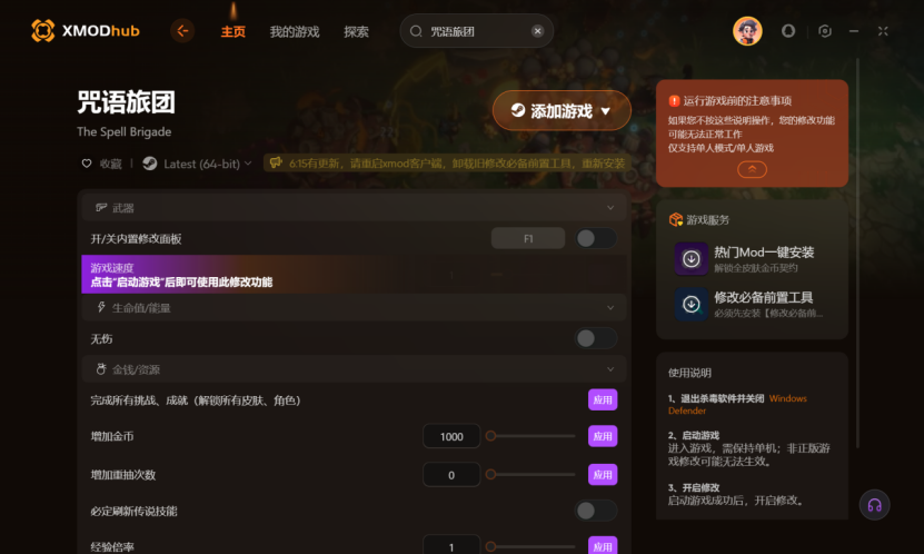 玩《咒语旅团》时,每个人对游戏节奏的需求都不一样。有的玩家喜欢快速通关,体验紧张刺激的战斗过程;有的玩家则想放慢脚步,仔细探索每个关卡的细节和隐藏内容。而 XMOD 修改器的设置游戏速度功能,恰好能满足不同玩家的需求,让我们可以随心掌控游戏节奏。